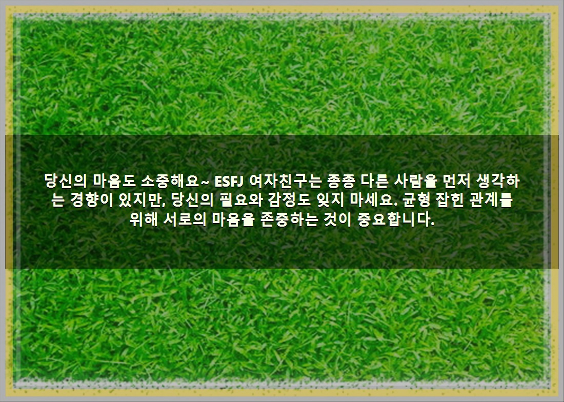 당신의 마음도 소중해요~ ESFJ 여자친구는 종종 다른 사람을 먼저 생각하는 경향이 있지만, 당신의 필요와 감정도 잊지 마세요. 균형 잡힌 관계를 위해 서로의 마음을 존중하는 것이 중요합니다.