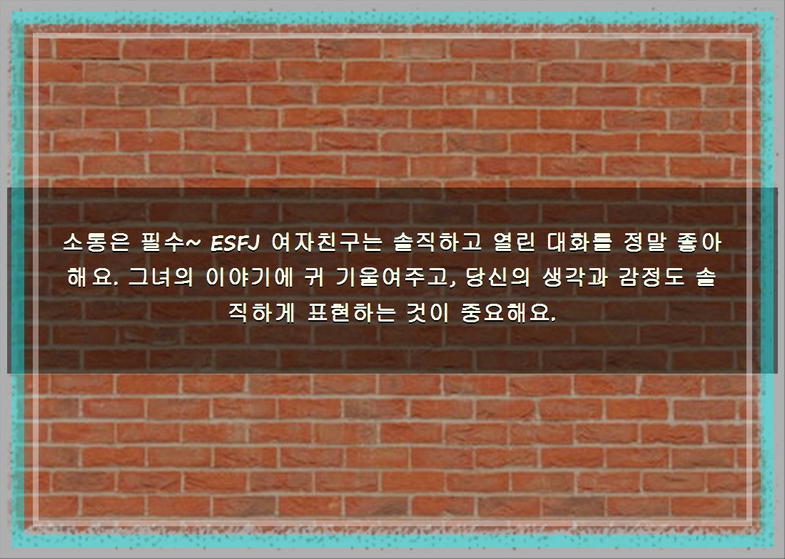 소통은 필수~ ESFJ 여자친구는 솔직하고 열린 대화를 정말 좋아해요. 그녀의 이야기에 귀 기울여주고, 당신의 생각과 감정도 솔직하게 표현하는 것이 중요해요.