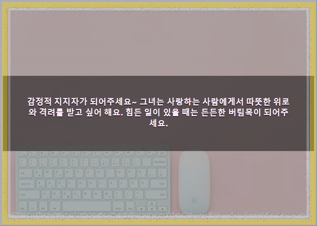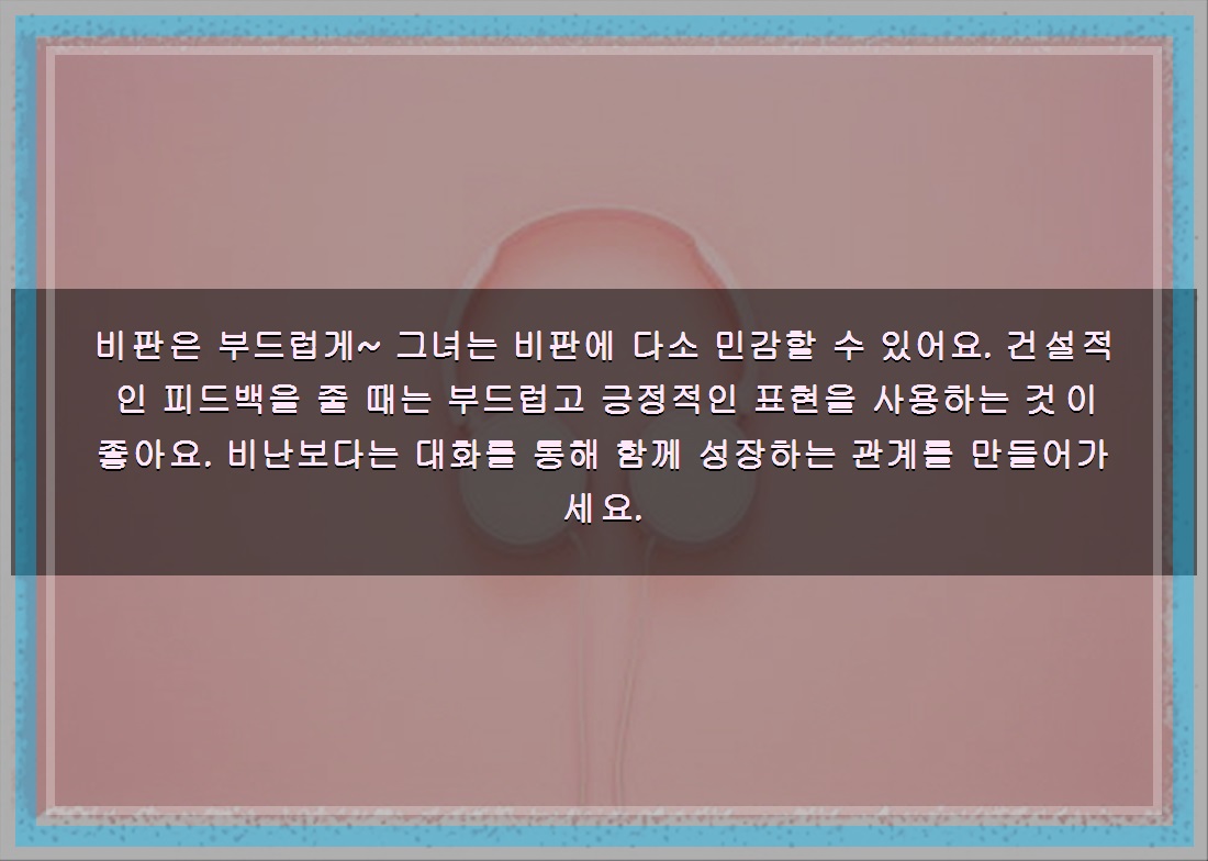 비판은 부드럽게~ 그녀는 비판에 다소 민감할 수 있어요. 건설적인 피드백을 줄 때는 부드럽고 긍정적인 표현을 사용하는 것이 좋아요. 비난보다는 대화를 통해 함께 성장하는 관계를 만들어가세요.