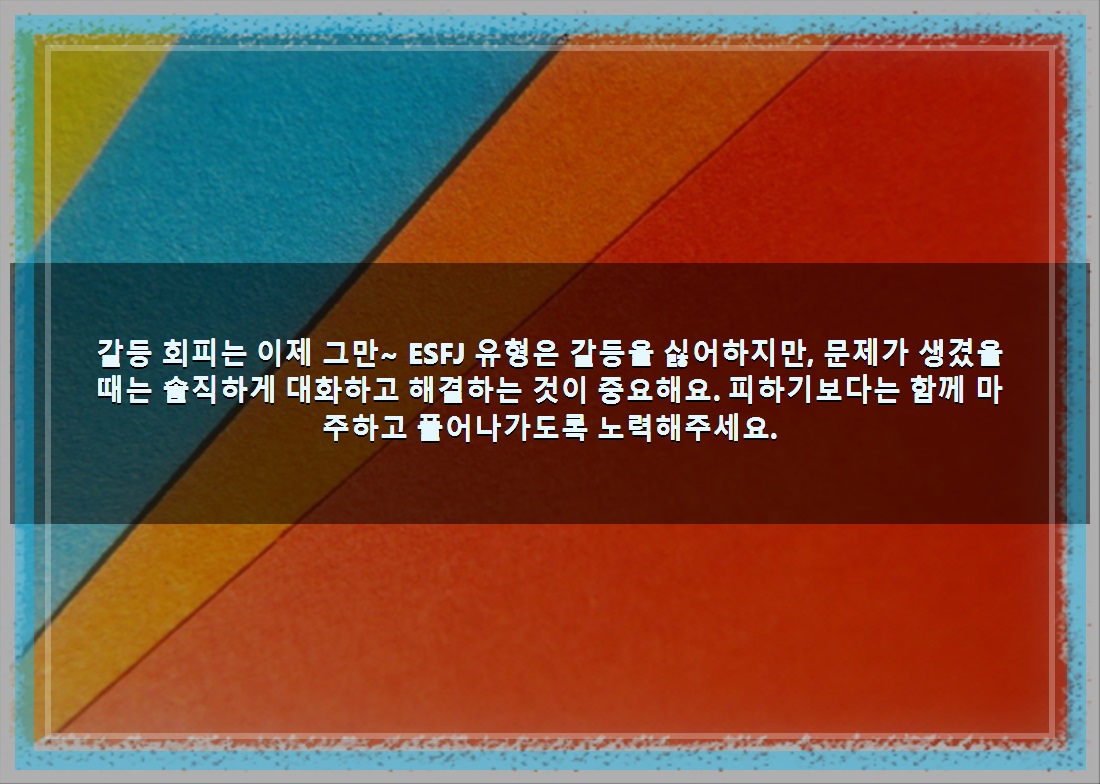 갈등 회피는 이제 그만~ ESFJ 유형은 갈등을 싫어하지만, 문제가 생겼을 때는 솔직하게 대화하고 해결하는 것이 중요해요. 피하기보다는 함께 마주하고 풀어나가도록 노력해주세요.