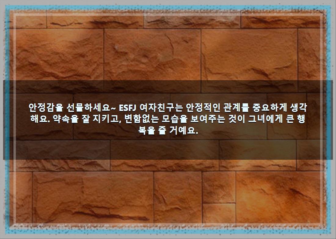 안정감을 선물하세요~ ESFJ 여자친구는 안정적인 관계를 중요하게 생각해요. 약속을 잘 지키고, 변함없는 모습을 보여주는 것이 그녀에게 큰 행복을 줄 거예요.