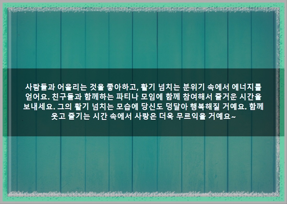 사람들과 어울리는 것을 좋아하고, 활기 넘치는 분위기 속에서 에너지를 얻어요. 친구들과 함께하는 파티나 모임에 함께 참여해서 즐거운 시간을 보내세요. 그의 활기 넘치는 모습에 당신도 덩달아 행복해질 거예요. 함께 웃고 즐기는 시간 속에서 사랑은 더욱 무르익을 거예요~