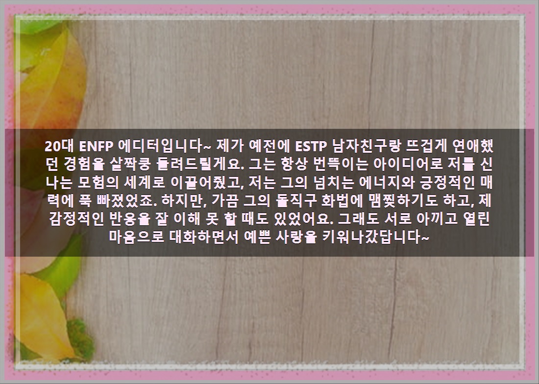 20대 ENFP 에디터입니다~ 제가 예전에 ESTP 남자친구랑 뜨겁게 연애했던 경험을 살짝쿵 들려드릴게요. 그는 항상 번뜩이는 아이디어로 저를 신나는 모험의 세계로 이끌어줬고, 저는 그의 넘치는 에너지와 긍정적인 매력에 푹 빠졌었죠. 하지만, 가끔 그의 돌직구 화법에 맴찢하기도 하고, 제 감정적인 반응을 잘 이해 못 할 때도 있었어요. 그래도 서로 아끼고 열린 마음으로 대화하면서 예쁜 사랑을 키워나갔답니다~