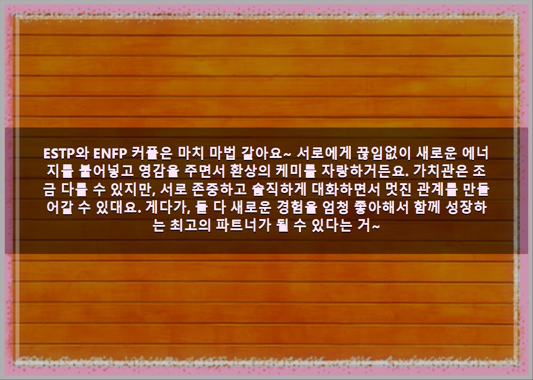 요약: 서로에게 퐁당 빠지다~ 자~ 그럼, ESTP와 ENFP의 짜릿한 만남: 불꽃 튀는 설렘과 완벽한 조화 정리하여 드립니다.